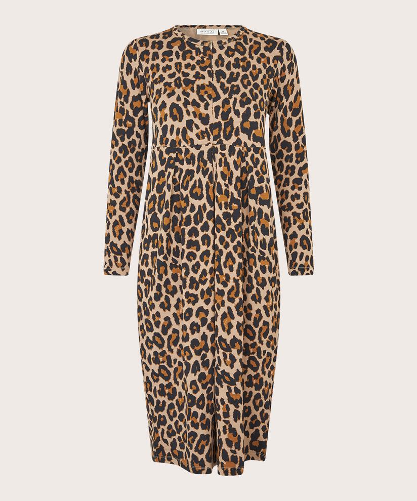 Den ikoniske tulipankjole er tilbage – nu med et twist! Den bløde jerseykvalitet kombineret med et klassisk leopardprint skaber et look, der både er feminint og cool. Den runde hals med lynlås tilfører en cool detalje, mens den flatterende pasform fremhæver figuren på smukkeste vis. Style den med høje støvler for et stilfuldt, ubesværet look, der passer til enhver anledning.