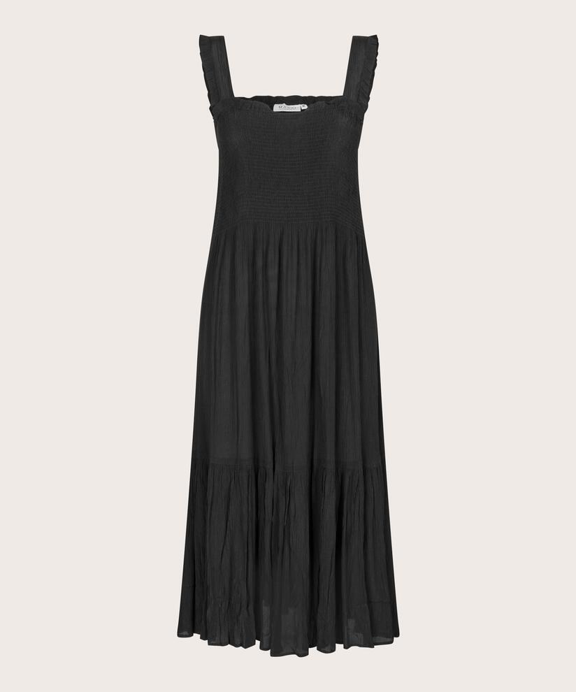 Denne feminine kjole er en absolut must-have i din sommergarderobe. De brede stropper med flæsedetaljer, smock over brystet og det løse, luftige skørt giver kjolen et let og elegant udtryk, der smukt følger dine bevægelser. Den bløde viskose føles fantastisk mod huden og gør kjolen perfekt til de lange, lyse sommerdage. Style den med sandaler for et afslappet look, eller tilføj høje hæle for ekstra elegance – uanset hvad vil du føle dig både fin og feminin.