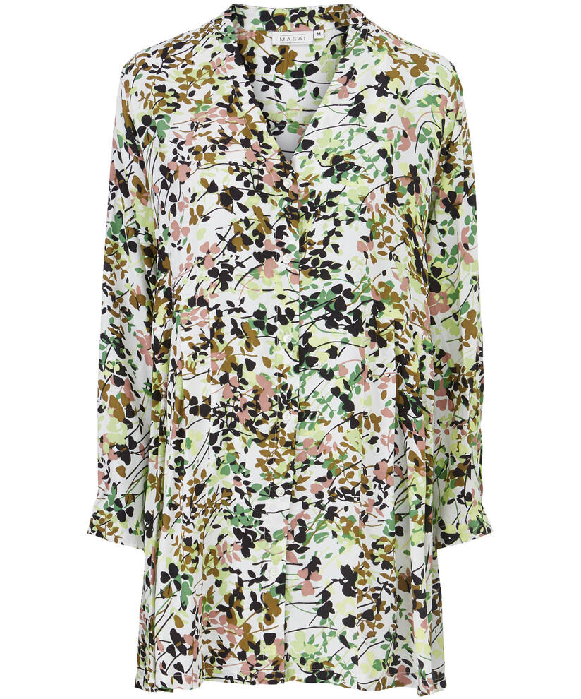 Skru op for boheme-looket med denne skønne skjorte med det fineste mønster af blade, V-hals og lange ærmer. Skjorten er designet med masser af læg, der understreger den fine A-form og giver det helt rigtige sving, når du går. Nyd også følelsen af den særligt bløde viskosekvalitet, der næsten føles som silke. Brug den over en smal eller løs buks eller åbentstående som jakke. Fin og feminin!