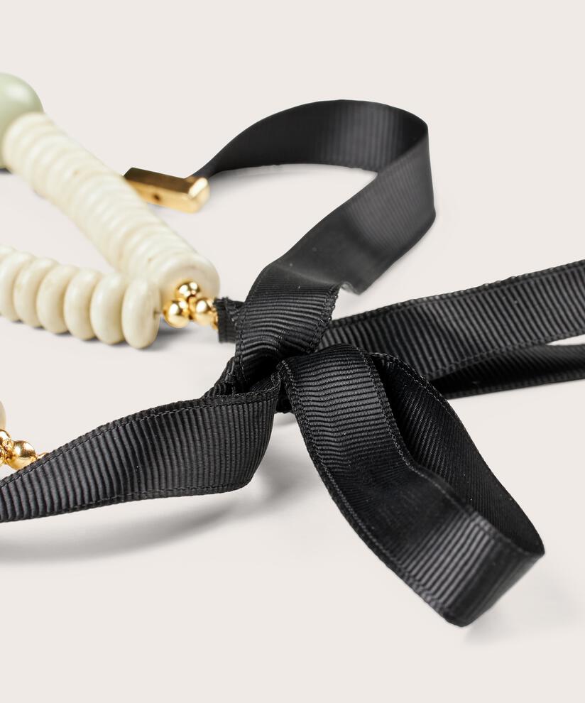 Top dit bohemelook med denne flotte halskæde. Kombinationen af perler i forskellige former og farver skaber en iøjnefaldende effekt. Kæden lukkes med en sløjfe på det sorte satinbånd i nakken, så du nemt kan justere længden, så den passer perfekt til dit outfit. Du kan bruge halskæden alene eller sammen med vores matchende øreringe for et gennemført look.
