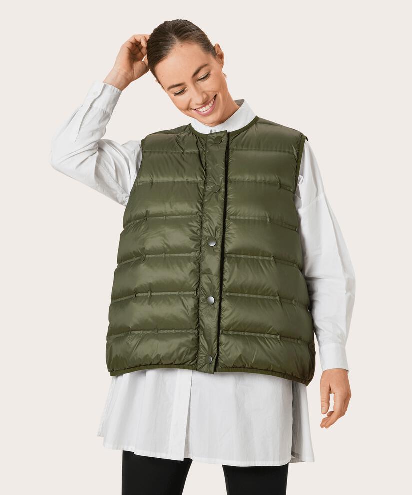 Føl dig let og godt tilpas, når de kølige dage tager over. Denne korte, bløde dynevest er ideel til at skabe et smart og lunt lag-på-lag look. De limede striber holder dunfyldet på plads og skaber en smart effekt. Vesten er designet med rund hals og trykknapper og er i al sin enkelhed nem at style. Brug den over en skjorte, tunika eller strik, og hold varmen med stil.