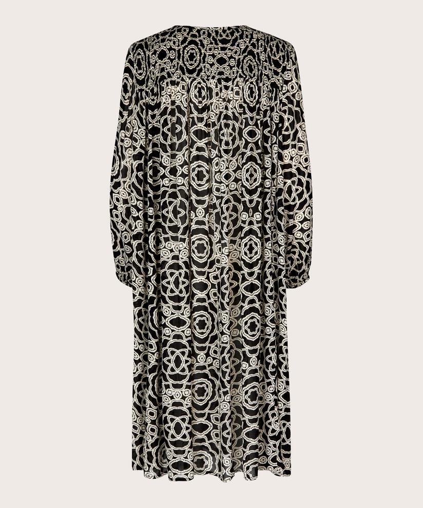 Der er ikke noget bedre end at finde en ny yndlingskjole, og denne luftige sag har det hele: Smukt sort-hvidt print, fine smock-detaljer og et bølgende skørt. Den transparente viskose er florlet og skåret i et feminint A-formet snit. Bemærk også de lange ærmer med elastikkant, der skaber en poset effekt. En skøn kjole, som du vil elske at hive ud af skabet igen og igen.