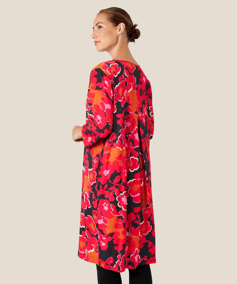 Sæsonen kalder på røde farver, og denne kjole med knaldrødt blomsterprint er lige i øjet. Kjolen har en flot A-form, der fremhæver brystet og ellers falder blødt ned over kroppen. Nyd den smukke dybe V-udskæring i halsen, der understreger det elegante og feminine udtryk. Kjolen er desuden designet med diskrete lommer – lige til at stikke hænderne i. Style kjolen med rød læbestift for et fuldendt festligt look.