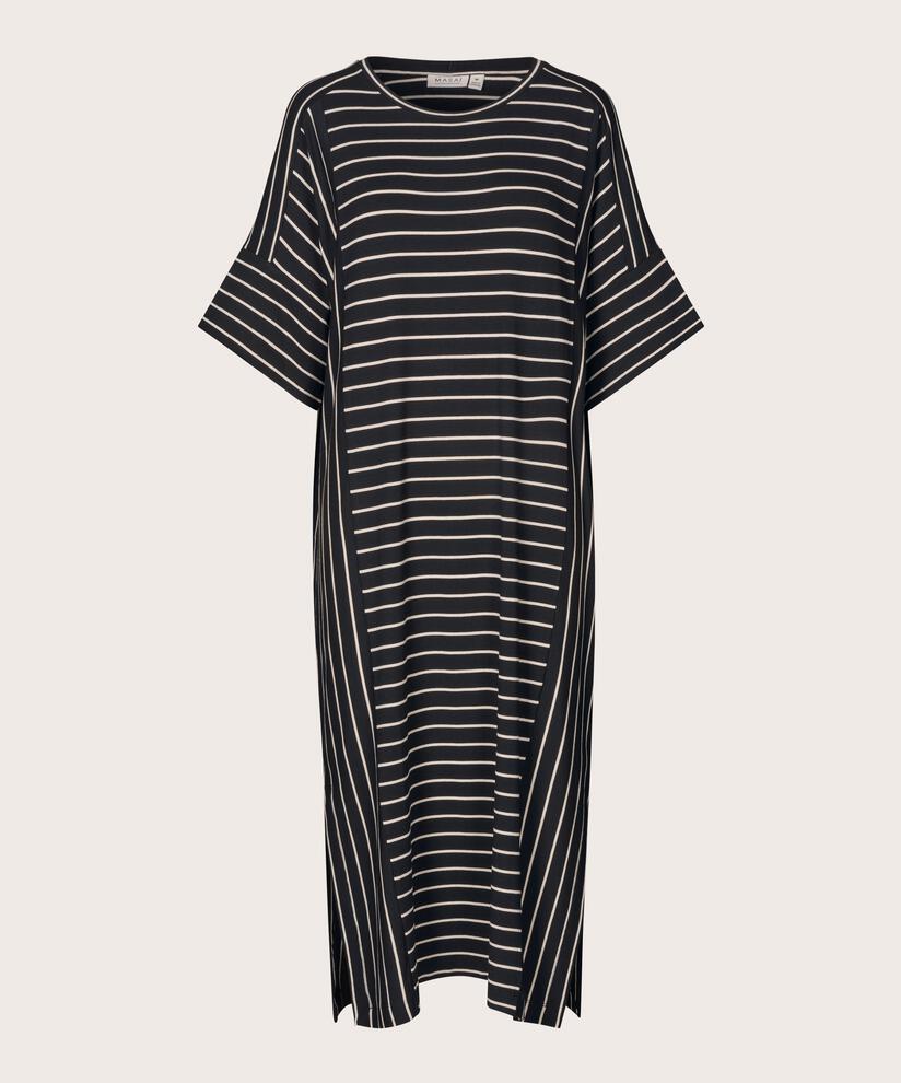 Skab et stilfuldt look med striber. Denne lange T-shirtkjole har en fin detalje, hvor striberne skifter retning. Den er fremstillet i en blød og eksklusiv jerseykvalitet med et oversize snit, så den falder tungt og flot ned over kroppen. Den byder desuden på rund hals og korte ærmer med ekstra vidde. Style kjolen med en skulpturel sort halskæde eller et hvidt tørklæde for et gennemført monokromt look.