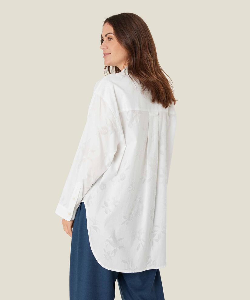 En oversize skjorte er en sikker klassiker i enhver garderobe. Med sin løse pasform falder skjorten flot ned over kroppen og byder på god bevægelsesfrihed. Denne skjorte byder desuden på et diskret vævet blomsterprint, der tilfører den et ekstra feminint strejf. Den er designet med en dekorativ brystlomme og høje slidser i siderne, der gør den superanvendelig. Brug den som en tunika over en buks, eller lad den stå åben som en let jakke i et smart lag-på-lag look.