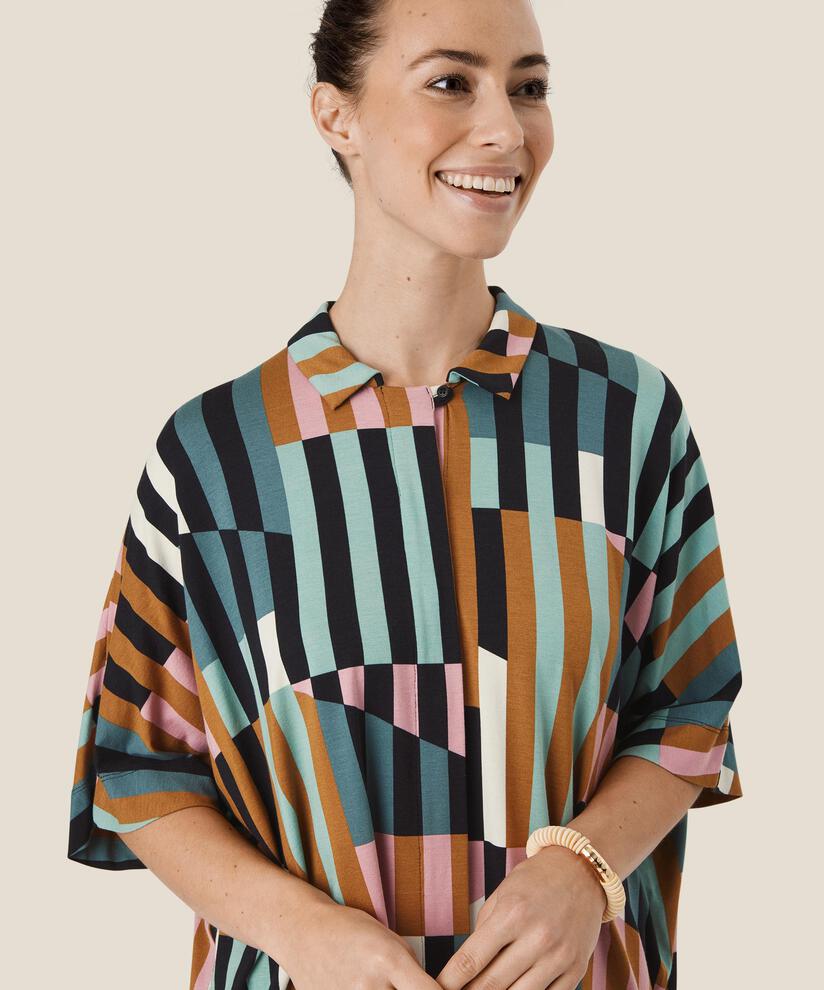Skab den perfekte balance mellem feminin og afslappet med de pastelfarvede geometriske striber, der pryder denne jerseyskjorte. Den eksklusive jerseykvalitet føles super blød mod huden, og med sit afslappede snit falder skjorten blødt og behageligt ned over kroppen. Skjorten er designet med en blød krave, korte ærmer og skjult knaplukning med undtagelse af øverste knap. Brug skjorten til ensfarvet buks eller nederdel for et feminint og yderst komfortabelt look.