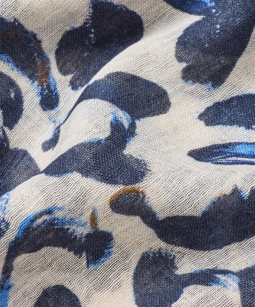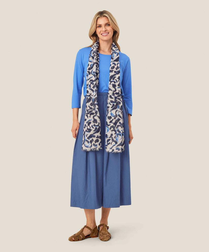 Et mønstret tørklæde er din genvej til et luksuriøst look. Dette tørklæde er dekoreret med et kunstnerisk mønster i blå nuancer, og det eksklusive mix af modal, bomuld og hør gør det superblødt at have på. Bemærk også de korte frynser i enderne. Lad tørklædet hænge løst om halsen for et afslappet, feminint look.