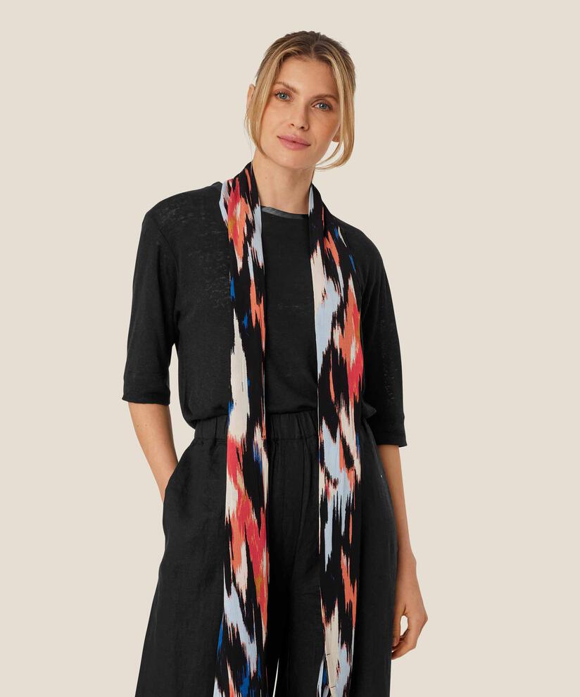 Selv et lille tørklæde kan have stor effekt, og dette mønstrede tørklæde er ingen undtagelse. Det er fremstillet med et dobbelt lag viskose og skaber med sit smalle design et let og stilrent udtryk. Lad det hænge løst ned over kroppen, eller bind det let om halsen for tidløs elegance.