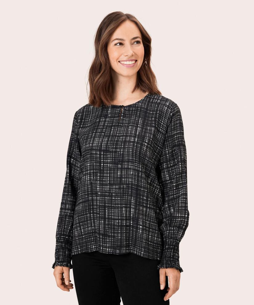 Denne ternede top er en sikker genvej til et personligt og feminint look. Den bløde viskose føles let og rar og er skåret i et flot A-formet snit. Toppen er designet med vide ærmer med bred smock, der skaber en flot poset effekt. Den har desuden en feminin drapering på ryggen, der giver lidt mere spil. Denne top, en smal buks og voila – du har et ubesværet stilsikkert look.