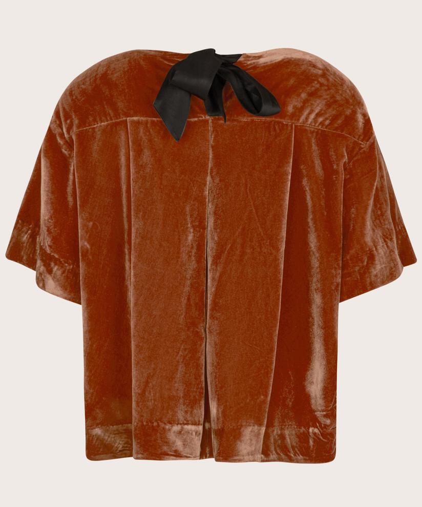 Velour er tilbage i modebilledet, og det porøse, elegante materiale gør sig rigtig godt på denne top. Toppen har en smuk brændt orange farve og er designet med en sort sløjfe og draperinger bagpå, der understreger det feminine udtryk. Det klassiske snit med lige linjer får den til at falde flot og flatterende ned over kroppen. Style toppen med en enkel sort buks for et stilfuldt look.