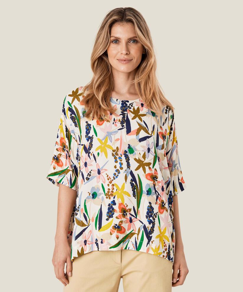 Det farverige blomsterprint på denne top er lige til at blive i godt humør af. Toppen har et løst, afslappet snit og byder på flere fine detaljer som smuk rund hals, korte slidser i siderne samt slids i nakken med knaplukning. Sæt toppen til en ensfarvet buks eller nederdel, og nyd følelsen af den bløde viskosekvalitet.