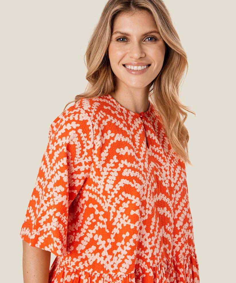 Toppen er designet med en lille slids i halsen, halvlange trompetærmer og et feminint skørt forneden, der understreger den flatterende A-form.