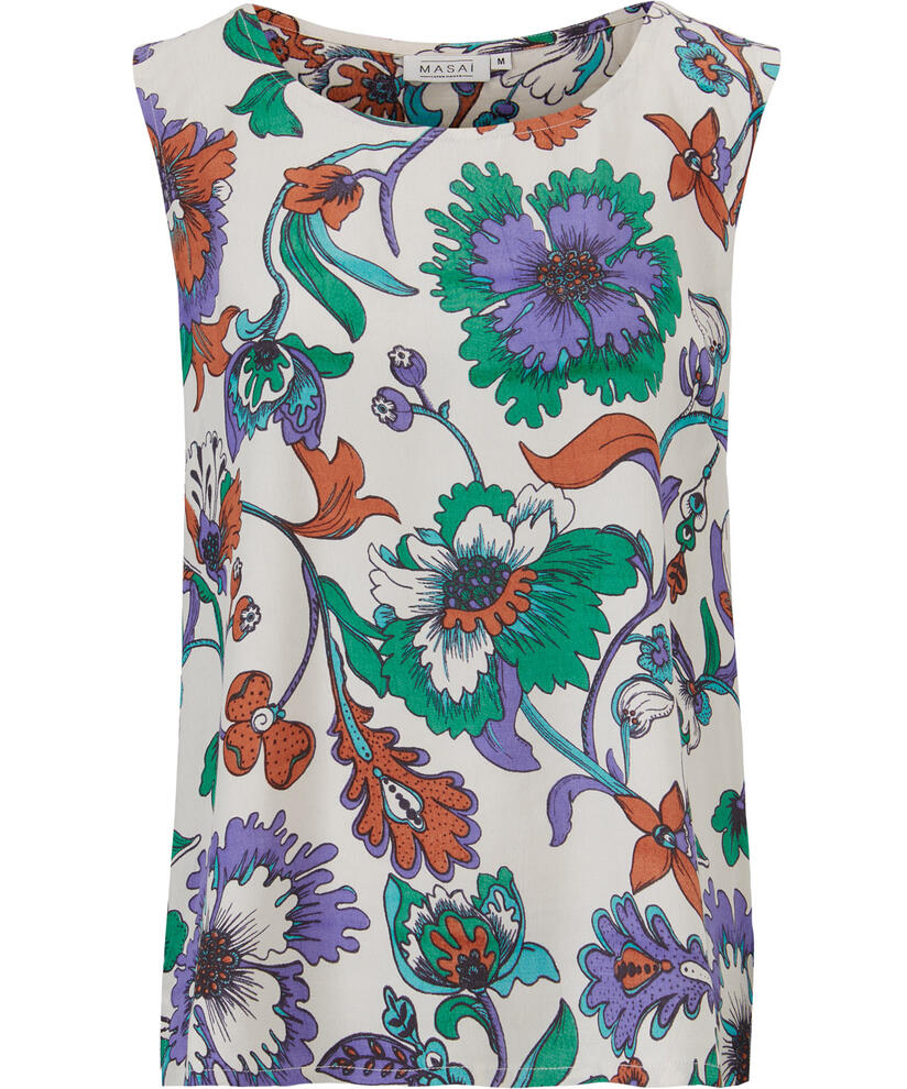 Denne viskosetop har et sprudlende blomsterprint, og passer med sine klassiske lige linjer til det meste.