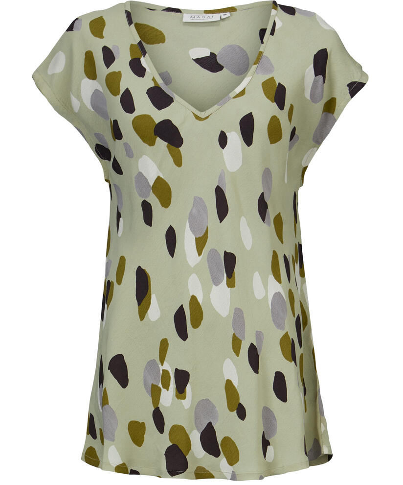 En smuk mønstret top lyser op i garderoben. Denne top er designet i en blød viskosekvalitet, der gør den skøn at have på. Stoffet er skåret på skrå, så toppen smyger sig smukt ind til kroppen og fremhæver din figur – uden at stramme nogen steder. Brug den som et lille farvepift under en cardigan eller strik.