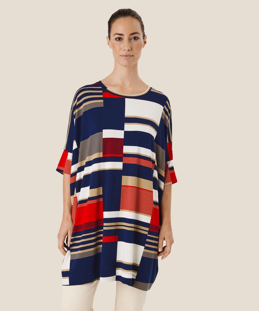 Sæt masser af kulør på din stil med denne mønstrede tunika, der med sit oversize snit falder løst og flot. Den bløde jerseykvalitet er et sikkert hit, der gør den skøn at have på, og tunikaens korte, smalle ærmer skaber en flot kontrast til den løsere overdel. En smart tunika, der gør sig godt i et lag-på-lag look med en smal eller løsere buks under. Skab for eksempel et fuldendt look med vores matchende leggings i samme print.