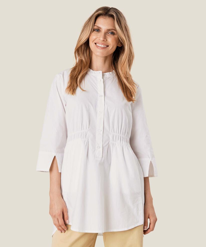 Med denne kridhvide tunika behøver du ikke at anstrenge dig – den skaber et feminint look helt af sig selv. Den er fremstillet i knitrende bomuld, der gør den blød og behagelig at have på, mens elastikken i taljen fremhæver det figursyede snit uden at stramme. Tunikaen er desuden designet med kinakrave, stiklommer, slidser i siderne samt en flot afrunding forneden. Style den med et par leggings eller en løsere buks.