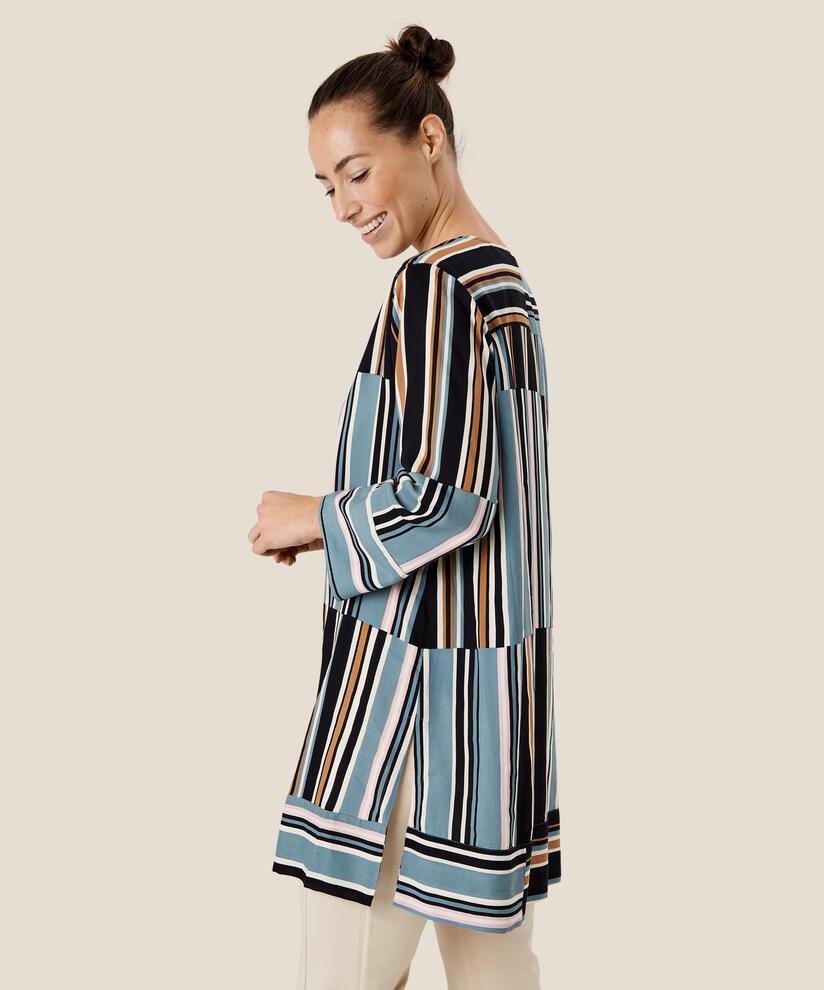 De klassiske striber har fået et kreativt og farverigt udtryk på denne smukke tunika. Tunikaen er skåret i en flot A-form, der får den bløde viskose til at falde løst og let. Den er designet med en feminin slids i halsen, høje slidser i siderne og trekvartlange ærmer. Tag tunikaen over et par jeans eller en smal buks for et enkelt, stilfuldt look.